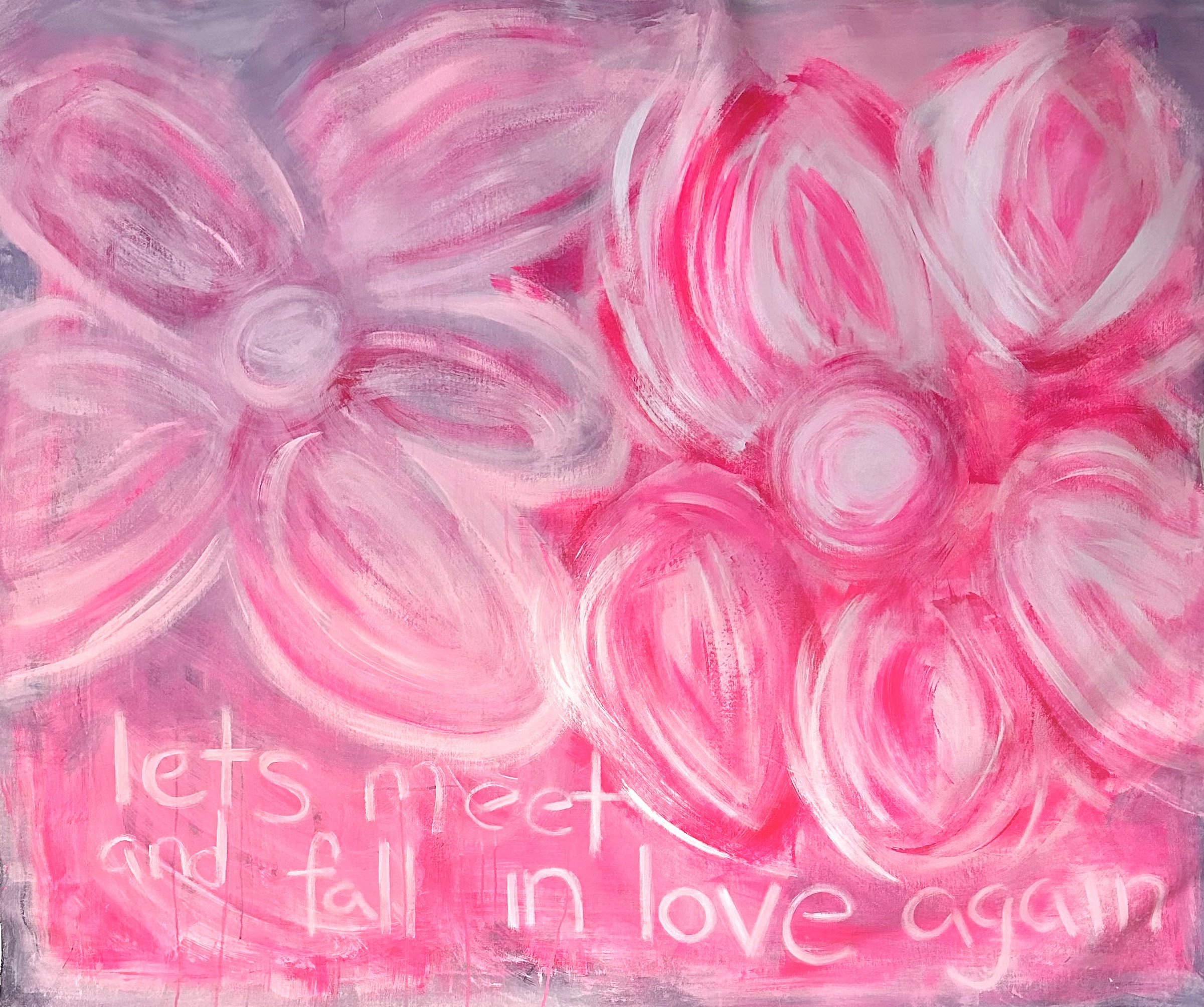 Two that look like flowers but aren’t. Strokes of color symbolizing the energy that exists between two people. Two who are eye-to-eye. With the soul, the spirit, the love they are…all that’s contained within our frames…ready to pour out to and for the other. The energy, the emotions within both swirling, expanding, dripping. The energy of desire. With that, the walls that were built have cracked and are crumbling. Lines behind drawn, erased, and re-drawn bigger. To carry the weight of words ready to be spoken, waiting to be heard.